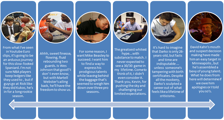 Did you know that Wesley Johnson (24), a rookie last year, is older than Kevin Love (23) and Michael Beasley (22)? Or that Beasley’s older than Ricky Rubio (21) and Derrick Williams (20)? The T’Wolves’ core is filled with youth, dreams and ceilings that reach beyond the firmament. To realize Kevin Love’s 30-30 game is to tip-toe into our past and dance with Moses Malone. To load up on youthful assets like David Kahn has done is put to faith in the future and bank on the development of at least one of Beasley, Johnson, Rubio, Anthony Randolph or Williams to partner with Love’s already historic body of work.