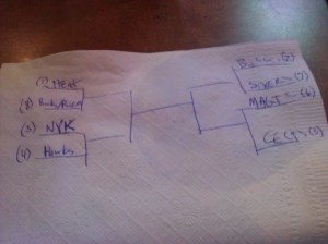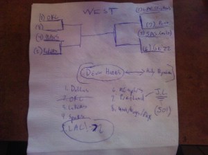 As you can see by the napkin below, the Western Conference analysis deteriorated or evolved (really open to interpretation) in depth, but sacrificed quality with comparisons being drawn between injury-prone players like Devin Harris and Andrew Bynum and the comparative value to their teams. The biggest argument here was between the four and five seeds—Lakers or Mavs; which was really just a debate about who would get home court advantage. Also, Milton refused to attach his name to a Clippers number two and instead preferred the veteran Spurs for that spot.