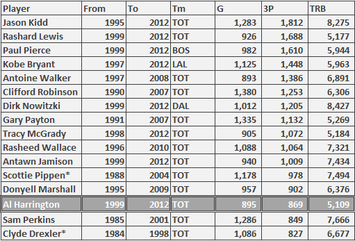 Today, I salute Al Harrington for both his commitment to growing his game and the fact that he’s a member of the recently created 5,000-800 Club–that’s at least 5,000 rebounds and 800 threes made. What does all that mean? It means he walks with Hall of Famers (Kobe, Gary Payton, Dirk, Pierce) and belongs to a small fraternity of long-range shooting big men who exist in part to confoud video game developers (Tim Thomas, Cliff Robinson):