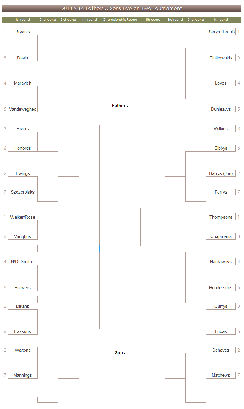The premise is this: In NBA history, there have been some 50-odd father/son combos including a few dads that spawned more than one NBA-playing son (looking at you Rick Barry and Jim Paxson Sr). I started wondering what would happen if those father/son combos laced up the kicks for a good old fashioned two-on-two tournament. There are a lot of questions you have to ask yourself when embarking on an endeavor like this, but I decided to keep it simple: 32 teams, single elimination tournament.