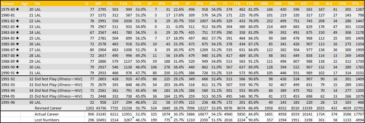 When I finally arrived at some oddball projections that wouldn’t pass muster in an elementary stats class, I found myself sort of empty. The numbers decline uniformly because my regressions are unimaginative, but the sum of what we missed out on amounts to a couple thousand rebounds, a few thousand more assists (he’d still be behind John Stockton), almost 5,000 points and a little over 10,000 more minutes. There would’ve been more memories and intrigues, battles with MJ and playoff triple doubles, but the extra codas these years would’ve added to his narrative are so significantly outweighed by his response to his own reality that I walk away from this piece with both a sense of failure at articulating any statistical intrigue and a greater sense of appreciation for the impact of the post-HIV Magic.