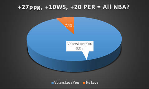 Since George Yardley made the All-NBA first team back in 1958 with the Detroit Pistons, the 27/20/10 has been a pretty safe way to ensure making one of the All-NBA teams. Of the 136 times players have achieved this mostly random set of statistical measures, 126 of those resulted in first, second, or third All-NBA inclusion – or roughly 93% of the time it’s an indicator a player will be tabbed for award-winning success.