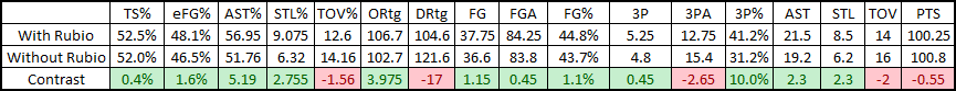 The Wolves are now shooting more threes, but making less, unable to find the easy shots which Rubio creates. They’re guided by a 19-year-old wing miscast as a point guard in uber-athlete Zach LaVine. Not surprisingly, turnovers are up and assists are down. ORtg and points-per-game are falling like sad snowflakes alongside dips in shooting percentages. Most telling is the hit to DRtg. With Rubio, the team had a 104.5 DRtg which is better than the league average, but without the maestro that number leaps to 121.6 which is worse than the Lakers’ miserable 117.8. To be fair, the two drivers of that spike are a couple of blowouts against New Orleans and Dallas, but with Rubio, those blowouts are maybe mere six-point losses with character building competitiveness.