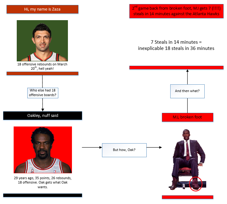For a sucker like me who’s prone to slipping and falling down rabbit holes with an Alice-like expertise, this was all too much to resist. Oakley’s game wasn’t just unique for the 18 offensive rebounds. Instead of resting on the laurels of setting a record, he mercilessly battered a Milwaukee Bucks frontline for 35 points, 26 rebounds, and seven assists with three steals for good measure. It was good enough for Oak’s career high points and second best rebound game. He grabbed 38% of his team’s own misses and 37% of all misses. Comparatively speaking, Zaza was at 37.7% OReb and Rodman was 38.5% — and the Worm also had a ho-hum 34 boards that night.