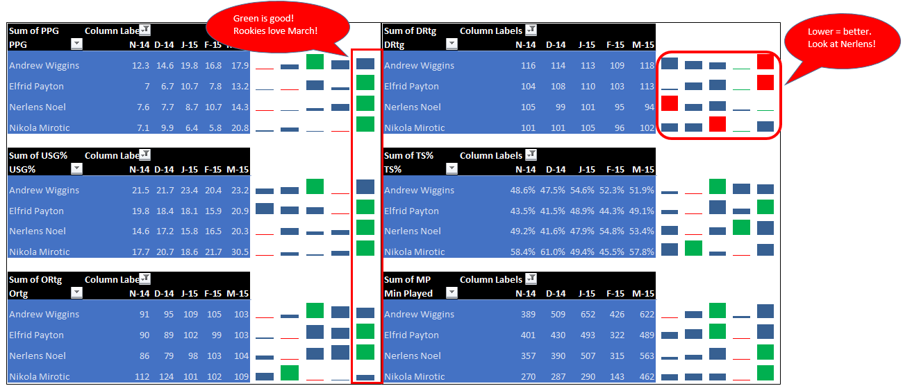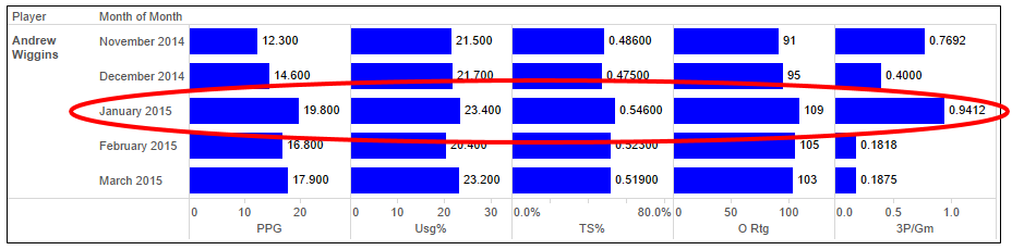 The number one pick and boringly-styled hair-having Wiggins hasn’€™t required the same type of learning curve as his cohorts. His monthly splits look like a pyramid of sorts with a steady climb through the holiday season and a peak in January. It’s not that he’€™s fallen off, just that his January with nearly 20-points/game, a 55% TS, 109 O-Rating, and nearly a three/game was better than anything else he’s done this year.