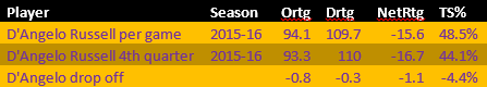 Russell was the second overall pick in the draft. Scott’s currently playing him about 5.5 minutes/4th quarter which is 10th overall in his rookie class, wedged between Jerian Grant (19th overall, 5.7 minutes/4th) and Frank Kaminsky (9th, 5 minutes/4th). The Lakers are 3-21 right now, losing by more than 10 points/game and prior to Kobe stepping in and disrupting Byron’s rotation schemes, Russell still couldn’t get court time. But in 4th quarters, Russell’s inefficiencies get worse. His TS% drops from 48% to 44% while his O and DRtg’s (per stats.nba.com) also get worse in the last period.