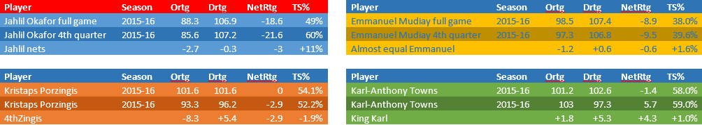 Winslow is the exception and not the rule for rookies. Number one overall pick Karl-Anthony Towns sees his NetRtg boost from -1.4 overall to +5.7 for 4th quarters, but still only sees six minutes/4th – much to the consternation of Wolves Twitter. Emmanuel Mudiay is second in mpg for rookies (29.9), but ranks fifth in 4th quarter minutes at 6.3 where his NetRtg drops from bad (-8.9) to worse (-9.5). Philly’s top choice Jahlil Okafor is getting 32 minutes/game and typically saves his best for last. In the final quarter, he averages his highest points while shooting 60% TS – up 11% from his overall TS. And any rookie conversation would be incomplete without the Lativian Gang Banger, Kristaps Porzingis. The Knicks are 11-14 and only one player on the roster with any impactful playing time has a positive NetRtg: the Zinger at +0.1.