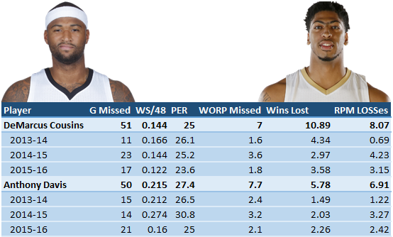 If we stick with Davis, we see a fairly consistent measure across the three metrics. For the 15-16 season where he missed 21 games, his WORP landed at 2.1, Wins Lost was 2.3, and RPM losses was 2.4. While there are a silly number of variables that play into the actual on-court results (like Jrue Holiday missing 17 games and sitting back-to-backs while playing limited minutes or Ryan Anderson missing 16 games, Alvin Gentry as new coach, and on and on), by current available measures, the loss of Davis, while no doubt a disruption to continuity and scheme, likely cost New Orleans 2-3 wins.