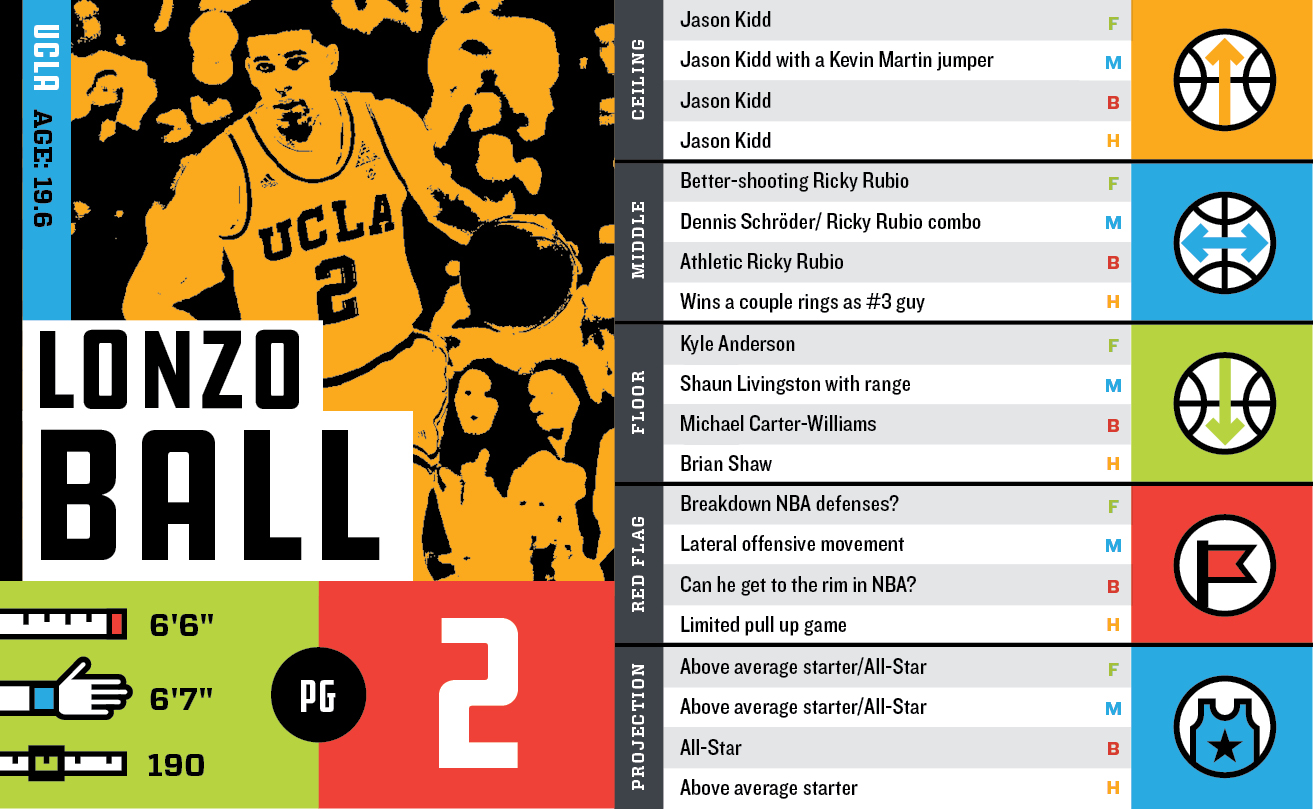 Bug: I’m a believer in the theory the great Isiah Thomas put forth in Bill Simmons’s Book of Basketball, “the secret to basketball is that it’s not about basketball.” The secret to Lonzo Ball’s game is not about the stats, it’s about being a floor general that puts his team in the best position to be successful. Zo doesn’t have stats that jump off the page, but his presence on the court instantly transformed a floundering UCLA program into an offensive juggernaut. It’s easy to get lost in the buffoonery of his father, Lavar Ball, but the talent of the kid is undeniable. Yes, he has an ugly shot, but if it goes in (41% from 3 on 194 attempts at UCLA), who cares? Everyone immediately thinks of Jason Kidd when watching Lonzo: big guard, great decision making, makes everyone around him better. In addition to the Kidd-like qualities, Zo can also go up and finish above the rim with ease. There is much debate about who should be the #1 pick in this year’s draft, but for me, I’m taking the point guard with the infectious style of play that uplifts an entire team. It’s not just about basketball, this kid will impact the entire culture of the organization that drafts him.