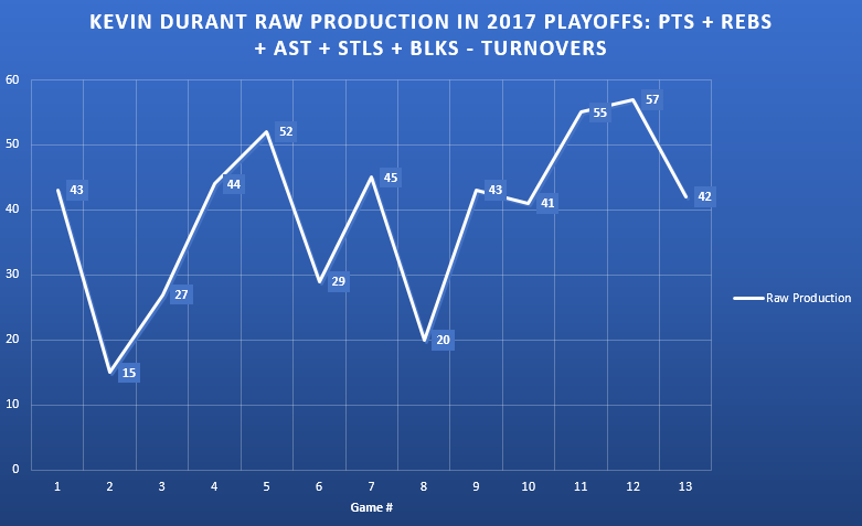 We know KD can do it on his own. He won his first scoring title at 21, his first MVP at 24. His finals performances have been less a surprise and a more a Cinderella-in-the-glass slipper moment whereby the most perfect player possible for the Warriors team schemes has slipped into the most perfect offense for his skills.