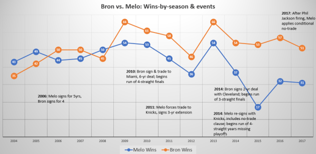 Maybe it all started back in 2006, 11 years ago when Barack Obama hadn’t even taken office and the future was about as clear as Phil Jackson in room with sage, incense, and other clouds of organic nature. Carmelo Anthony and LeBron James signed extensions with their teams: Bron three years with a player option for the Cavs. Melo, four years with a player option for Denver, and thus began a gradual resetting of courses that at one time appeared maybe, kinda parallel. The ensuing years have revealed not just a gap in on-court skill sets, but a gap in decision making and how these megawatt star players leverage their power to achieve both on and off-court goals.