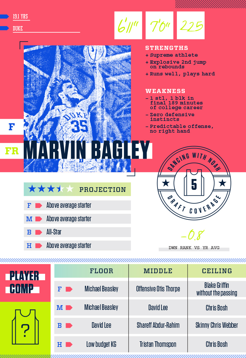It would appear the rest of his game hasn’t caught up with his scoring and rebounding. He couldn’t muster one block or one steal per game. Each of the other bigs at the top end of this draft bettered his 1.7 combined blocks and steals per game. During the final six games of the season, two ACC tourney and four NCAA tourney, he got two steals and blocked one shot. In six championship-level-competition games, the guy averaged .33 steals and .17 blocks. Not great. It should be concerning that an explosive 4/5 with a great second jump isn’t reading the game defensively. That’s a plausible answer considering how hard he runs and how well he rebounds. It’s not about effort, but something else. If you move as well as Bagley you ought to be getting your hands on some passes and shots. This is also where the comparisons to young KG and Toronto Chris Bosh fall apart.