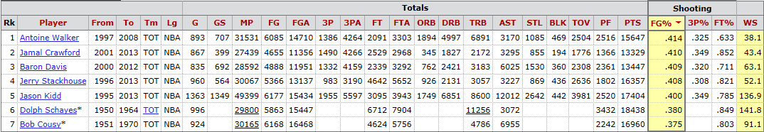 Jamal Crawford (1st appearance): I struggled with the decision of whether or not to include Crawford on this list and at the end of the day his handle, heat checks, Seattle pedigree and the fact that bloggers and number crunchers are taking the time to discount his effectiveness were enough reason to add him. For me, this is a bit of a career award though. Crawford’s one of the good guys in the game and even though he’s one of just seven players in league history who’s scored over 13,000 points with a field goal percent of 41.5 or lower, he can still fill it up and give the Clips another competent ball handler.
