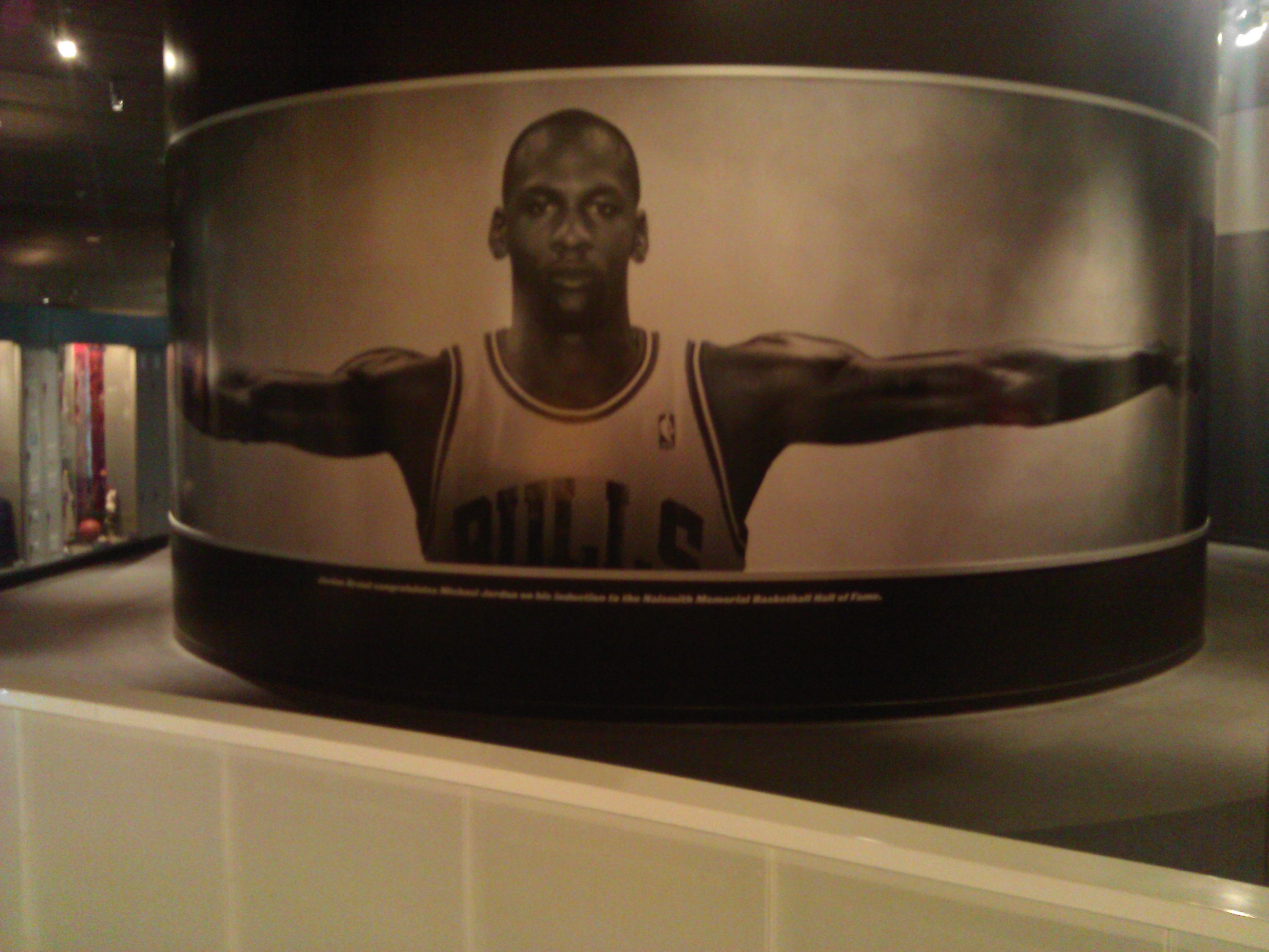 A week ago, I had the good fortune of passing through Springfield, Massachusetts and stopping off at the Basketball Hall of Fame where I spent a couple hours acting like a kid in an interactive Toys’ R’ Us museum. I gawked and stared at the memorabilia and basked (no joke) in the memories the photos brought to mind. I took a picture of the player photos that surround the interior dome of the BHoF and sent it to my basketball-loving amigos and in the same manner I was drawn to the game back in the late 80s, the focus orbited around Michael Jordan.