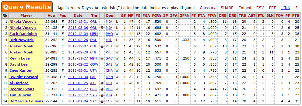 Regardless of your fondness or Rob Henningan’s fondness or the fondness of Vucevic’s own parents for his development this season, none of us expected this type of growth and development. Keep in mind, Vucevic, didn’t even arrive in the states until 2007. He averaged 12rpg as a senior in high school and never over 10.3rpg in his three seasons at USC. He showed promise as an NBA rookie averaging 10.9rpg over 36min/game, but nothing, not even his lineage (his dad Borislav was a pro player for 24 years—24!), predicated this season’s rebounding explosion.