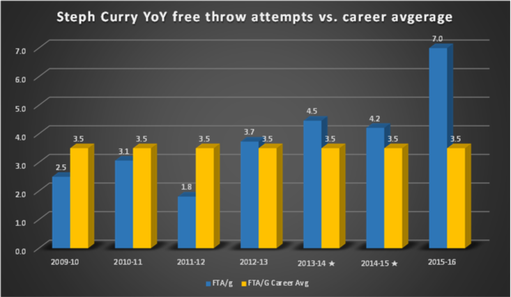 So Curry’s hovering around the perimeter, chucking record-setting threes and hitting them at paces typically reserved for guys who trade volume for efficiency. He’s taking advantage of spacing and passing and ball movement and all that good stuff. Yes to all of that, but for any notion that he’s merely perfecting the areas of already-existing strength while other aspects of his game stay flat or see small rises, he’s again a step ahead. For his career, Curry’s shooting a paltry 3.5 free throws/game. He’s third all-time in FT% just behind Steve Nash and Mark Price, so he’s getting the most bang for his free throw buck, but at 3.5 attempts/game with a career best of 4.5, he’s good at getting to the line for a point guard, but nothing special. In our shortened present season he’s somehow expanded his offensive range to include seven FTAs/game. For a guy that shoots over 90% from the line, seven FTAs/night is free points, a rhythmic bonus that builds on what’s already elite confidence. Where his increase in 3PA/game was a stunning 64%, his increase in FTA/game relative to his career average is nearly double at a 99% increase and the graph below more so than the others above clearly illustrates this spike.