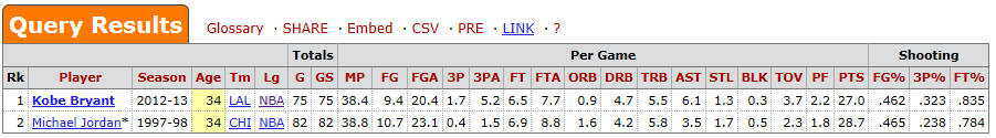But as I started this post, I’ll reiterate: In a vacuum … I’m not interested in opening up or hashing out or re-hashing debates that have no ending. After Kobe’s game yesterday, a 14-point loss to the Clippers that gave them a 4-0 sweep in the Battle for Los Angeles; a game in which Kobe played 47 minutes (Mike D’Antoni’s never been shy about running guys into the ground and most elite athletes need someone to force them to rest, so the Kobe/D’Antoni combination is mostly a poor match when it comes to the long-term consideration of Kobe’s physical health), I found myself asking: Who does this? Who plays 47 minutes at 34-years-old? Who’s 34 and putting up 25 points and 10 assists? So I did what I do, I had to answer this question for myself and the answer was interesting enough to share it with you: