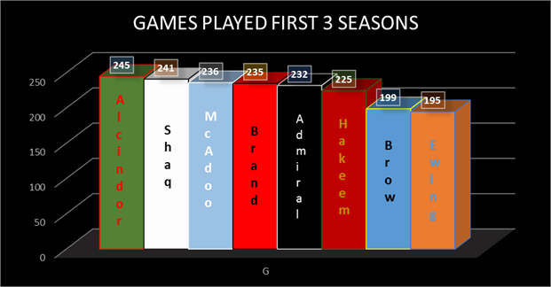 If we consider the players in the 24/10/2.5 club as some sort of bright and shiny baseline to compare against Davis from a purely durability view, we get the following breakout across each player’s first three seasons: