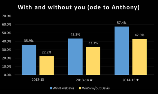 2014-15: Davis misses five straight games, but when he returns the team wins five of seven (71%)