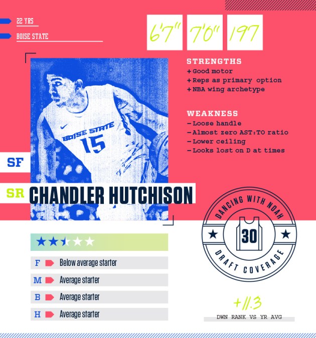 Hamilton: Chandler Hutchison looks all the part of today’s NBA wing. He’s 6’7 with a 7’1 wingspan that helps him appear bigger at times, as evident when he’s tipping or pulling down one of his 7.7 defensive rebounds per game. Some of those rebounds come from a high effort level that also led to 1.6 steals per 40 minutes over his four years at Boise State. The steal stats themselves could be a bit misleading as a real measure of his defense as he does appear to get lost pretty easily while off the ball. At times he makes indecisive or incorrect reads and rotations. But he has a real skill for staying with plays that can be matched with good NBA coaching to turn him into a plus defender. On offense he’s decisive and moves the ball quickly either with the pass, or more likely, on the dribble. It’s probably not fair to label it “iso ball” because he’s so deliberate on the attack that his teammates don’t end up standing and watching too much. His handle has a nice little hesitation to it that could suit him well running pick and roll. Hutchison pulled out of the combine on May 16 prompting many to assume he was offered a draft guarantee from a team. While it’s unlikely a lottery team would reach for Hutchison, several teams selecting in the 20s could be good fits for him. Playoff teams like Indiana at 23, Portland at 24 or Philly at 26 could all use an effort/energy wing who is physically mature and used to making plays.