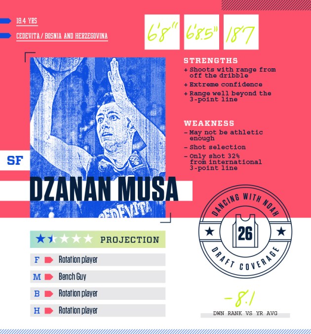 Bug: It’s always hard to get a good read on young European players in comparison to the guys we get to see in the NCAA numerous times before entering the draft. Whether it be competition level or the Euro style of play, the stats and video clips can be deceiving. One thing when you watch Dzanan Musa play is that this guy has brass balls on the court. Musa is equipped with a lightning-quick release and range well beyond the three-point line. He also has a nice handle for a 6’9” wing, and changes speeds well to free himself up for shots. The Bosnian product seems to carry himself with a Westbrook-like confidence as if he believes he is the best player on the court at all times. Musa only shot 32% from three this past season, which is a red flag for a player with such an exciting highlight reel of deep balls. That means there were a lot of bricks that came along with the exciting highlights. Musa will need to continue to expand his dribble drive game and get stronger as NBA defenders will look to run him off the line and make him put the ball on the floor. He won’t have the free reign to have the ball at all times and shoot whenever he wants in the NBA, so he’ll have to become more efficient to see the floor. A lack of strength on his 195-pound frame will also make him a defensive liability in his early years. The team that drafts him will need to be patient with his adjustment in that aspect. Musa is one of the youngest players in the draft, just turning 19 years old in May, so he has a lot of room to grow, both in terms of physical size and skill. Dzanan is shaping up to be a mid-to-late first round pick which will help him learn from some veterans on an established team. I believe he’s probably two-to-three years away from contributing, but looks like a strong prospect to take a chance on in the 20-30 range.