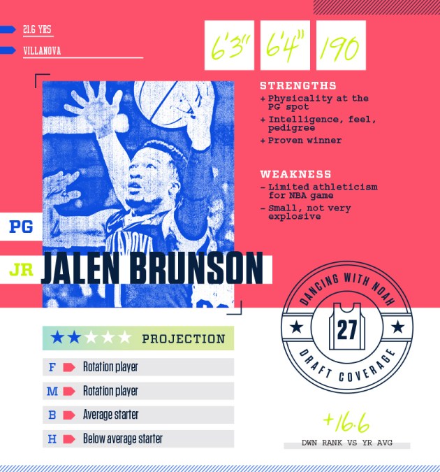 Bug: Most draft pundits have the reigning College Player of the Year ranked as a late first, early second round pick in this year’s draft. On our initial big board, I had Jalen Brunson ranked 15 spots higher than anyone else in our crew at 14th overall. The combination of a weak point guard class and the positional importance of having a quality starting and backup point guard in today’s NBA boost Brunson’s value. The draft is loaded with average wings this year, so I ranked Bruson higher based on the supply and demand of quality point guards. There are some obvious physical limitations to his game. He’s a below-the-rim player that doesn’t overwhelm opponents with athletic dominance or size. Brunson may find it to be tough sledding at times on both ends against top-level point guards, but you can say the same about every point guard in this year’s class. Despite those limitations, he’s always found a way to overcome and win games. Dating back to his senior year in high school, Brunson has won three titles in his last four years of competitive basketball, compiling a 133-16 record in that span. Winning is definitely a skill when assessing point guards.  In addition to winning big at each level he has played, he grew up around the NBA as the son of former NBA player Rick Brunson. Having a father that played in the NBA teach you the game is a huge advantage coming up in your developmental years. Brunson has a nice handle, and always plays within himself on the court. He knows exactly what his strengths are and doesn’t try to do more than he is capable of doing. He has a sturdy 6’2”, 200-lb frame, a high basketball IQ, and uses his body well to play the angles to get to his spots. The Villanova product also sports a smooth lefty stroke from deep at a 40% clip on more than 200 attempts. Brunson is somewhat of a throwback that gets compared to Mark Jackson quite a bit due to his highly advanced post game (for a PG), but he doesn’t have the elite vision of Jackson as a playmaker. There were many Villanova games this past season where Brunson was the best post player on the floor for either team, but there won’t be many nights in the NBA where he’s going to have the size or strength to utilize that skill very often. On the defensive end, Brunson has a Chris Paul-like competitiveness to him. He plays physical defense and is somewhat of a pest. I believe Brunson ends up being a steal if he goes where he is slotted late in the first round. He’ll most likely settle in as a high-end backup/fringe starting point guard that ends up having a lengthy pro career. The flashy highlights and freakish combine measurables are great, but wins are what keeps coaches and GMs from getting fired.