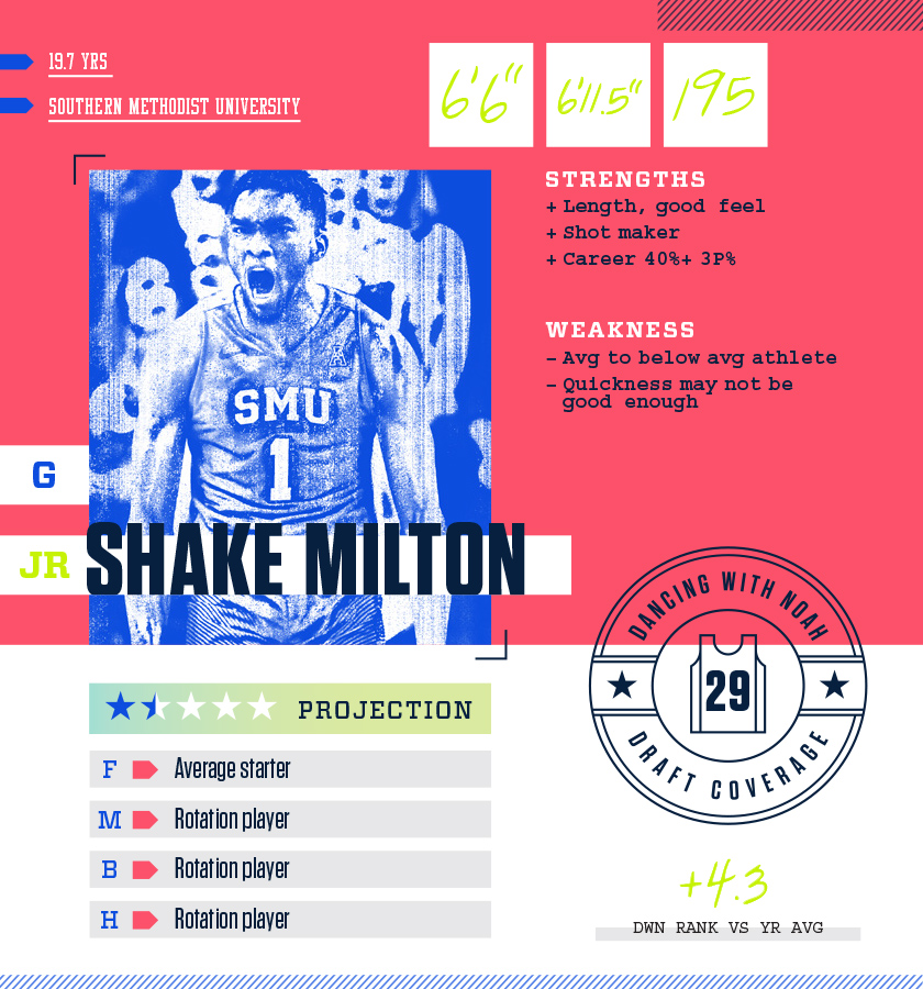 Fenrich: I see all kinds of NBAers in Milton’s unhurried, pendulous movements. He has shades of Dejounte Murray’s length and floater. His handle and lithe collegiate frame call to mind a less pizzazzy Jamal Crawford. With his height (6’5.5”) and ability to see and make the pass (4.4 assists), I think of Jalen Rose. And the son of the “Milk Man” is probably a better shooter than all of them – he definitely was in college. His 43% from three on 445 attempts is an excellent number and his range extends to the NBA distance. He shoots it from deep with a form that remains consistent. In the clips I’ve watched, SMU ran multiple pick-and-rolls and he regularly saw the roll man and executed the pass. Skill-wise, he appears to be NBA ready. Athletically, he falls short. Watching his tape, it’s clear there’s a lack of explosiveness off the dribble. It doesn’t prevent him from getting into the paint as the combination of his handle and ability to use the jumper to set up the drive are enough to beat defenders, but at the next level, this will be more difficult. His max vertical at the combine (33”) landed him in the bottom 25th percentile of participants. Defensively, I didn’t see as much of Milton. The little I did see showed a player more prone to bending at the waist instead of the knees. For a player lacking athleticism, his defensive technique needs to improve. Rose and Crawford are perfect examples of good, but not great athletes who leveraged their high skill levels and unique physical compositions into lengthy and successful NBA careers. Kyle Anderson comes to mind as someone who, while possessing an exceptional feel for the game, has struggled due to lackluster athleticism. It’s a broad range from Rose to Anderson, but somewhere in there is likely where Milton’s NBA destiny lies.