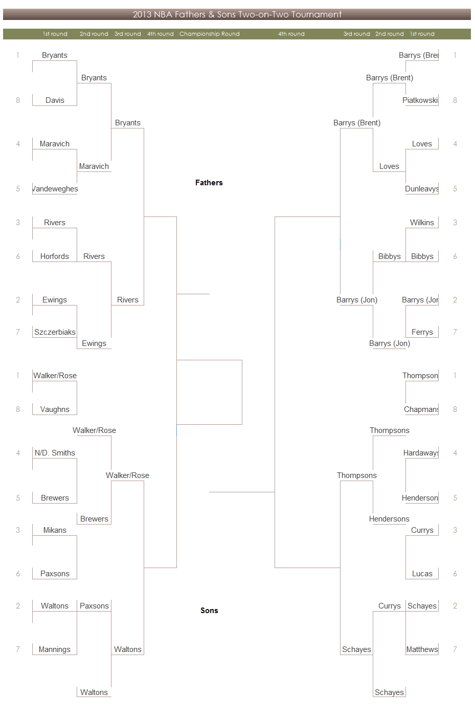 True to NBA form, upsets have been fleeting. Just a single under-seeded team has advanced to the quarterfinals: The Rivers’. Nothing was too surprising coming out of the second round except the contrasting motivational techniques used by the Doc Rivers and Jellybean Bryant. One propped his son up while the other motivated through chopping down. As we step into the semi-final round the most intriguing matchup in the bracket is the Barry family quadrant where Rick/Brent will face off against Rick/Jon. We’ve seen a lot of Barry-fueled aggression already so I can’t wait to see how Rick Barry deals with the complexity of Rick Barry. Other questions to ponder as you lie in bed struggling to doze off at night: