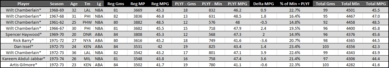 The 4k threshold has been surpassed 55 times in NBA/ABA history with 36 of those seasons occurring in the pre-modern period when Wilt Chamberlain and Bill Russell stalked North America feasting on the blood and bones of knobby-kneed opponents. The top-10 of most combined regular and playoff minutes all occurred between 1961-62 and 1973-74 when pros wore low-top Chuck Taylor’s, shorts that would make John Stockton blush, and didn’t yet have the perks of chartered air travel or modern exercise science. The list below is made up of Wilt and Kareem, then four guys from the ABA which had an 84-game season.