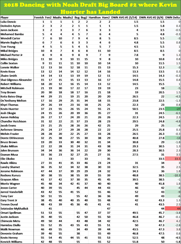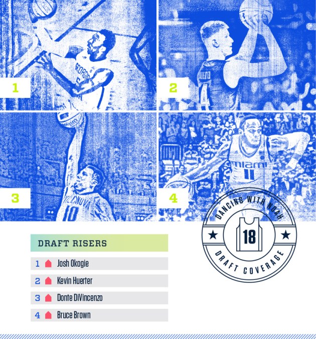 There are some massive risers: Maryland’s Kevin Huerter, Donte DiVincenzo of NCAA Championship fame, Rodions Kurucs (I’m not certain why he rose), elite rebound collector Jarred Vanderbilt, Georgia Tech’s all-world athlete Josh Okogie (it’s a soft “g” in Okogie).