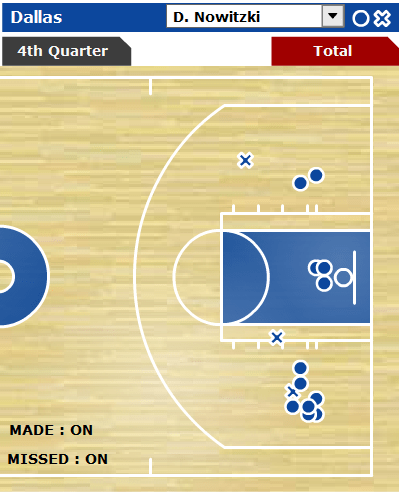 Through the first four games of the finals, Dirk’s putting up over 26 points/game, pulling 10 rebounds/game and even blocking a shot a night. Against one of the best defenses in the league, this shit is not easy. Other than being white, he’s not like Bird. Other than having the flu in the NBA Finals, he’s not like MJ. He’s fucking unique in more ways than just being a dominant German in the NBA. His game is his own, but his relentlessness is his overlooked trademark. From the opening to the end of every game, he attacks, catching the ball at the top or in the mid-post, throwing shot fakes, hesitations and stutters, fading away into an arc of perfection, occasionally driving, but always attacking with one technique or another. But even heroes fail. In game three, it was Dirk’s turn to run out of classic-making magic. In the last minute of what ended up being a two-point loss, Dirk threw the ball away and then missed one of those jumpers that he does not miss.