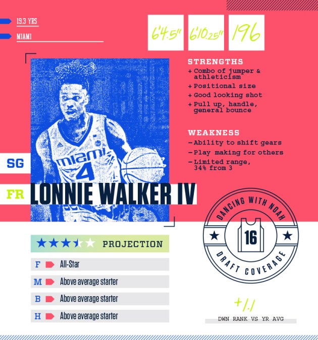 I’m uncertain why I’m somewhat enamored with Lonnie Walker IV, but since I saw him donning the orange and green of the Miami Hurricanes, I’ve been fond of him. He’s just under 6’5”, but sports a “pineapple” hairstyle which he describes as “its own person this point…people have been calling it a pineapple” that pushes his peak height up around seven feet. Imagine this kid, 6’4” or 6’5”, pineapple do’ bouncing atop his head, arms stretching out like a bald eagle (over 6’10” wingspan), sprinting, reading the arc of the ball, crouching and coiling in mid-step, and ba ba ba BOOM exploding into tip dunk motion with those long arms reaching and powerful legs propelling (40” max vertical) him into the rim. This is just part of Lonnie Walker allure. I’m not too big on coachspeak, but his Miami coach, Jim Larranaga, described him on a broadcast that he, “might be the nicest person I’ve ever coached.” Watching his NBA combine interview, I don’t know if I’d go as far as saying he’s the “nicest,” but that’s not really the purpose of the interview. He’s not quite Mo Bamba polished, but he was engaging and thoughtful, referring to himself as a “knowledge freak” and oddly suggesting “earth is an illusion.” A questionable statement, but not one that takes away from a jumper that looked good at Miami (31% from three on 3.5 attempts/game in his first 15 games at Miami coming off of a meniscus tear suffered in July versus 36% on 6.5 attempts in his final 17 games), but looked great at his agency’s pro day in late May. In the limited, non-competitive setting of the pro day, Walker’s form was refined and his range easily extended to NBA distance. But I’m not convinced what type of player he’ll be at the pro level. His handle was sufficient for the college, but he seems to struggle to shift speeds on dribble drives. His passing (1.2 assists to 1.2 turnovers in first 15 games versus 2.5 assists to 1.1 turnovers in his second) is similar to his ball handling in that it was fine for Miami where they had two other competent ball handlers, but will need work to be a secondary NBA ball handler. Physically, the foundation is there for a strong pro, but it’s the outside shot that already looks to be NBA-ready that lifts his ceiling so much higher. I put his ceiling comparison as Bradley Beal, but I’m not convinced Walker has the same instincts as a scorer. In high school, he averaged just 18-points as a senior and during his best stretch at Miami (an eight-game swing in the winter), he averaged 18 which was better than his 11.5 during the season, but still not indicative of high level scoring. I was probably over-ambitious in seeing Beal or even Eric Gordon (his mid-level comp) in his game, but given the league’s shift towards the three-ball, it’s not inconceivable that Walker is a better scorer in the pros than he was in either high school or college. That he’s engaging and appears willing to work at his craft only increase the likelihood that he can near his potential and are probably part of the attraction to the kid with the pineapple hair.