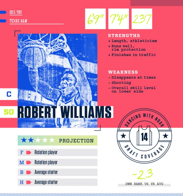 Robert Williams has the physical profile of a contemporary NBA center. He’s a quick leaping big(ish) player who runs well and has great balance. He plays kind of like a smaller DeAndre Jordan but moves like Rudy Gay. He lacks the handle or shooting to be a wing player in the NBA, however. But there’s a nice career path for true small ball center offering legit rim protection. He tries to dunk everything around the hoop and many of his shots come in the paint and go up quickly via dishes, lobs, and rim runs in transition.  He attempted an underwhelming 70 free throws in 30 games, only attempting more than five in four games. This could be due to how and where he operates but could also be a concerted effort on his part to not get himself to the line. I’d probably try to stay off the line if I shot 47% too. Defensively, he works himself into nice positions for blocks, often coming over from the weak side. For how well he moves around in tight space he probably should have rebounded better in his second season at Texas A&M. 9.2 is good but it just looks like he should be getting more. That sort of thing is the knock on him – he’s not consistent and leaves you wanting more. There were two significant stretches, one at each end of the season, during which he failed to get double digit points. It doesn’t seem that he lacks an NBA motor; instead he just doesn’t keep it in a high enough gear consistently. For reasons like this he’s just a little too feast or famine to be worth taking early. The fit matters even more for players like him whose engagement and effort are fleeting. Landing on a team with good culture that genuinely cares about player development is going to be key for Williams to get off to a positive start and could determine how long and how successful his pro career turns out to be.