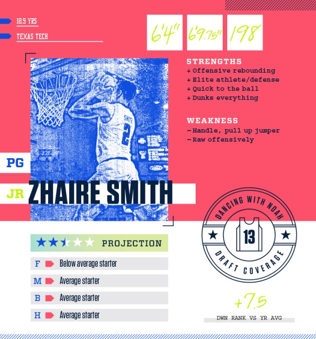 Zhaire Smith’s unexpected rise could mean he’s either a late bloomer cut from the Russell Westbrook cloth, or, more simply an athletic standout whose skills won’t ever catch up. In his freshman year at Texas Tech he came out of nowhere both literally and figuratively. He was projected to play only 10-12 minutes per game but instead logged 28 on his way to 11 points and five rebounds with 58% eFG. This wasn’t your run of the mill Texas Tech team either. The clear number-two in the Big-12 ended up a three-seed and made it all the way to the Elite 8. Smith came out of nowhere literally by flying in for tip dunks and rebounds over bigger players. A 6’4” guard getting almost three offensive rebounds-per-game is impressive. He pops up around the ball a lot on both ends and plays hard. That effort combined with elite physical tools can carry a player a long way. Smith told the ESPN combine crew he played center in high school and didn’t shoot threes until his senior year. My fellow Iowan Ricky Davis had a similar career at Davenport North. He’s another NCAA/NBA wing with elite athletic gifts that didn’t get to adequately develop his perimeter skills in high school. Ricky transitioned quickly to the wing at Iowa, but I always had the feeling his development was a stunted a bit by playing out of position during formative years. On the other hand, there’s something to be said for battling big players and learning to play in the paint. That may be even more useful in the modern NBA with all the switching and defenders guarding pretty much everyone at one time or another. Jimmy Bulter and Jae Crowder both played a lot of center at Marquette and have turned into two of the toughest and physical perimeter defenders in the NBA. Smith’s rebounding ability and instincts around the hoop show he picked up some things that may help him at the next level. A few of his weaker performances came against tough college defenses like Villanova (seven points, 3-8 shooting) and West Virginia (four points 1-4; nine pts 3-7). He’ll need to improve his ball handling, passing, and most of all shooting from outside to come close to the ceiling his athleticism has set for him. At this point he is just figuring out what do to with his powers and looks like a player teams picking between 10 and 15 will be afraid to take and afraid to pass up too.